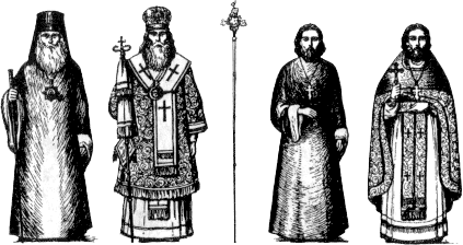 სურათზე მარცხნივ: შავი სამღვდელოება (ბერები - მათ შორის ეპისკოპოსები)