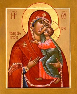 ჰოი, ყოვლადწმიდაო ქალწულო ღუთისმშობელო, ქერუბიმთა უმაღლესო და სერაფიმთა და ყოველთა წმდათა უბრწყინვალესო, შენ ყოვლადსახიერო, რომელმან ტოლგსა შინა ხატსა შენისა მრავალთა მკურნალისა ცეცხლის სახითა გამოჩინებაჲ ინებე წინაშე ნეტარისა მღუდელმთავრისა ტრიფონისა მის მიერ მრავალნი სასწაულნი აღასრულენ და კვალადცა აღესრულებიან ჩუენდა მომართ დიდითა წყალობითა შენითა. შთაუვრდებით შენდა მომართ ყოვლადწმიდასა ხატსა შენსა და ვხმობთ, უფროსადკურთხეულო შუამდგომელო ერისა ჩუენისაო: მრავალვნებულსა და მრავალტანჯულსა მიწიერსა მწირობასა ამას შინა ჩუენსა ნუ განმაშორებ მეოხებასა და სამუფოსა საფარველსა შენსა, შემეწიენ და მაცხოვნენ ჩუენ, დედუფალო, ისრისაგან მაცთურისა აგზებულისა მტრისა ჩუენისა მიერ, განამტკიცენ უძლური ნებაჲ ჩუენი, მოამდოვრენ გულნი ჩუენნი აღსრულებითა მცნებათა ქრისტესითა სიყუარულითა ღუთისა და მოყუასისათა. მომმადლენ ჩუენ შემუსვრილებაჲ გულისა და სინანული ჭეშმარიტი და ბნელთა ცოდუათაგან განწმიდენ ჩეუნ, რაჲთა გვაქუნდეს წინაშე შემოქმედისა ნაყოფნი კეთილნი ქველის-საქმეთაგანი და მშვიდობითსა ქრისტეანობითსა აღსასრულსა ღირს-ვიქმნეთ და მართალსა სიტყუისგებასა საშინელსა და თვალუხუავსა სამშჯავროსა მისსა. ჰოი, დედუფალო ყოვლადმოწყალეო უმეტესად გარდამოგვივლინე ყოვლადძლიერი მეოხებაჲ შენი ჟამსა საშინელსა სიკუდილისასა, ისწრაფე ჩუენდა - უძლურთა შეწევნად და ყოვლისმპყრობელითა ხელითა შენითა გამომიხსნენ ხელმწიფებისაგან მძვინვარისა ამა სოფლისა მპყრობელისა, რამეთუ ჭეშმარიტად მრავლისშემძლებელ არს ლოცუა შენი წინაშე ღუთისა და არა არს შეუძლებელ მეოხებისა შენისათვის. ეგრეთვე წმიდასა ხატსა შენსა ლმობიერად შეუვრდებით და წინაშე მისსა, ვითარცა ცხოველისა, მუხხლთა მოვიდრეკთ და თავთა თვისთა და ურთიერთსა და ყოველსა ცხორებასა ჩუენსა შევვედრებთ და გადიდებთ შენ, შენგან შობილსა და მაცხოვარისა ჩუენისა - უფლისა იესუ ქრისტესა, დაუსაბამოჲსა მამისა და სულისა წმიდისა თანა და მისა მიმართ აღუვლენთ პატივსა და თაყუანისცემასა, აწ და მარადის და უკუნითი უკუნისამდე, ამინ!