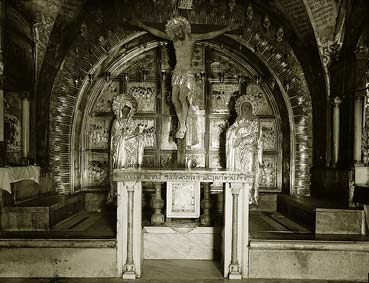 მარჯვენით ტრაპეზისა მოსჩანს გაპობილი კლდე, რომელიც გასქდა იმ წამსა, რაჟამს უფალმან განუტევა სული ჯვარსა ზედა. ტრაპეზზედ არიან დაკიდებულ 14 ძვირფასნი ლამპარნი, შეწირულნი ქრისტეანეთა მეფეთაგან. იატაკი არის მოფენილ თეთრისა, შავისა და წითელის ქვითა. მარჯვენით მართლმადიდებელთა ტრაპეზისა, სამხრეთით კერძო, არის სამწირველო ფრანგთა, რომელიც მხოლოდ ღვთის მსახურების დროს განიყოფება ფარდითა.