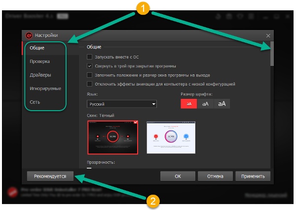 Данный раздел содержит множество пунктов, которые видны на изображении выше. Главным тут является пункт «Настройки», где пользователь может полностью подстроить программу под себя [1] или установить значения, рекомендованные самой программой [2]:
