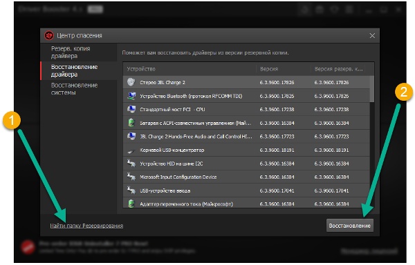 Все резервные копии сохранены и готовы к использованию в случае необходимости. ВосстановлениеВ предыдущем пункте мы создали копии. Но как их использовать? Это можно осуществить из самой программы с помощью функции восстановления драйверов: Для запуска процедуры восстановления выбираем папку [1], в которой хранятся копии (изначально программа самостоятельно устанавливает папки, куда сохраняет бэкапы и из которых их извлекает), и нажимаем на кнопку «Восстановление» [2]: