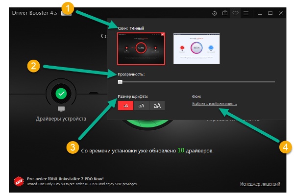 Вкладка «Опции»Опции – это последняя вкладка в верхнем меню программы Driver Booster: