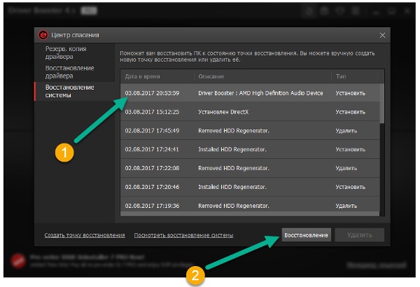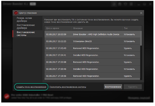 Переходим к последней функции в данном разделе. Восстановление системыДанная функция необходима для восстановления системы к прежнему состоянию в случае возникновения каких-либо критических ошибок. Обычно точки восстановления создаются автоматически перед внесением каких-либо изменений в систему. Программа Driver Booster самостоятельно сформирует список всех созданных точек: