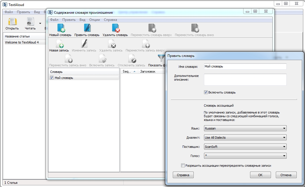 NextUp TextAloud 3 — легко прочтёт для Вас Web-страницы, любые документы, тексты, письма которые Вы хотели бы услышать. Звук для дальнейшего прослушивания позволяет сохранять в форматах WAV, MP3 или WMA. Читает из буфера обмена, текстового файла, документы Word, PDF, HTML и интегрируется в IE, Firefox и Outlook. Теперь вы можете читать почту, книги, большие документы, новости и пр. не отрываясь от основных дел и не надевая свои очки. Программа допускает установку дополнительных синтезированных голосовых движков для разнообразия языков и акцентов.
